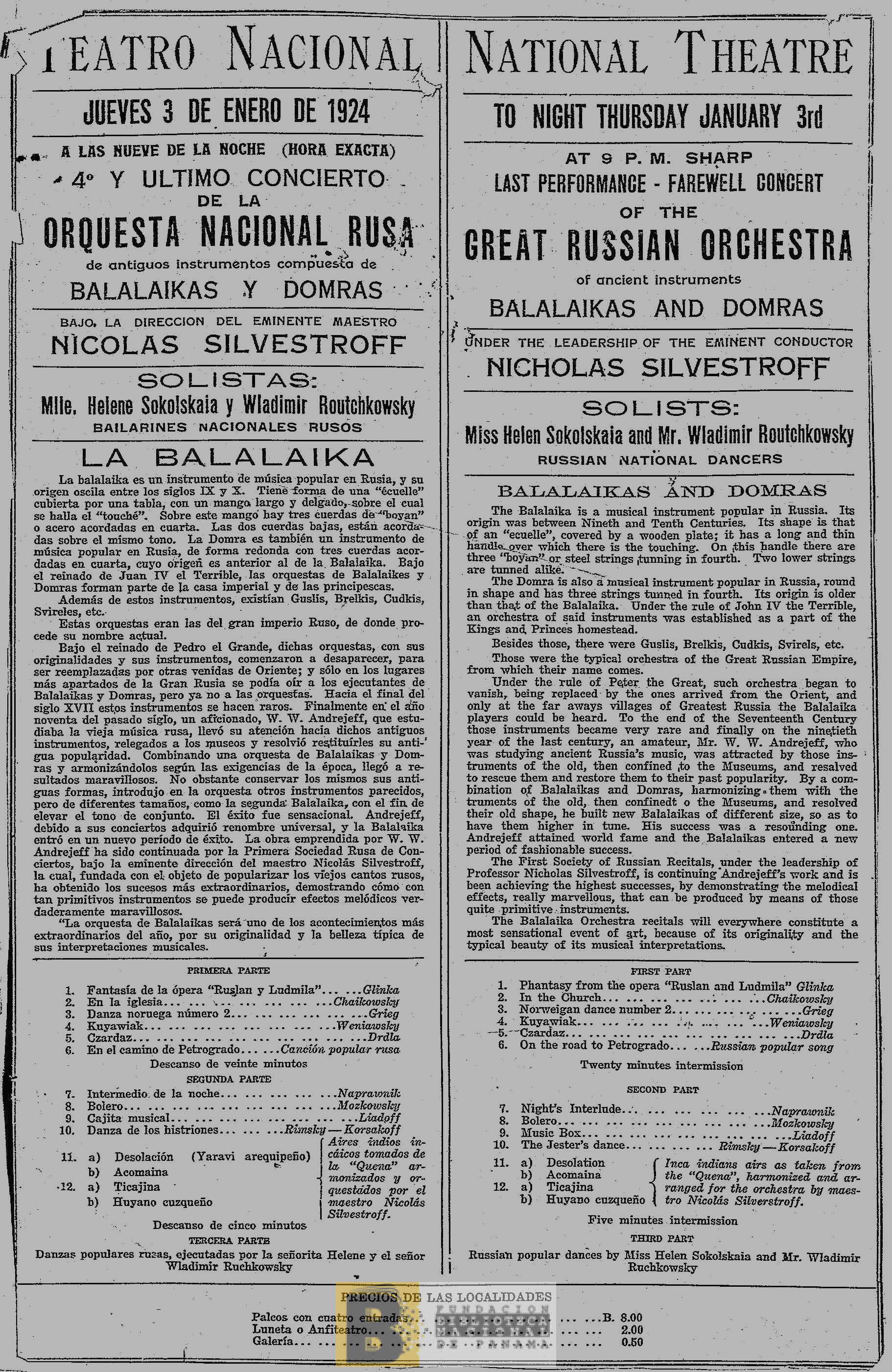 13. 4o. y último concierto de la Orquesta Nacional Rusa de antiguos instrumentos compuesta de balalaikas y domras, bajo la dirección del eminente maestro Nicolas Silvestroff; solistas: Mlle. Helene Sokolskaia y Vladimir Routchkovsky, bailarines nacionales rusos