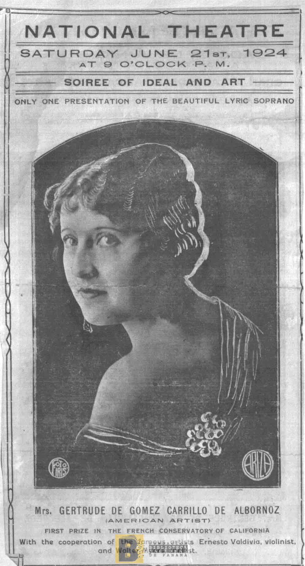 2034. Only one presentation of the beautiful lyric soprano Mrs. Gertrude de Gómez Carrillo de Albornoz (American artist), First prize in the French Conservatory of California, with the cooperation of the famous artists Ernesto Valdivia, violinist and Walter Myers, chellist