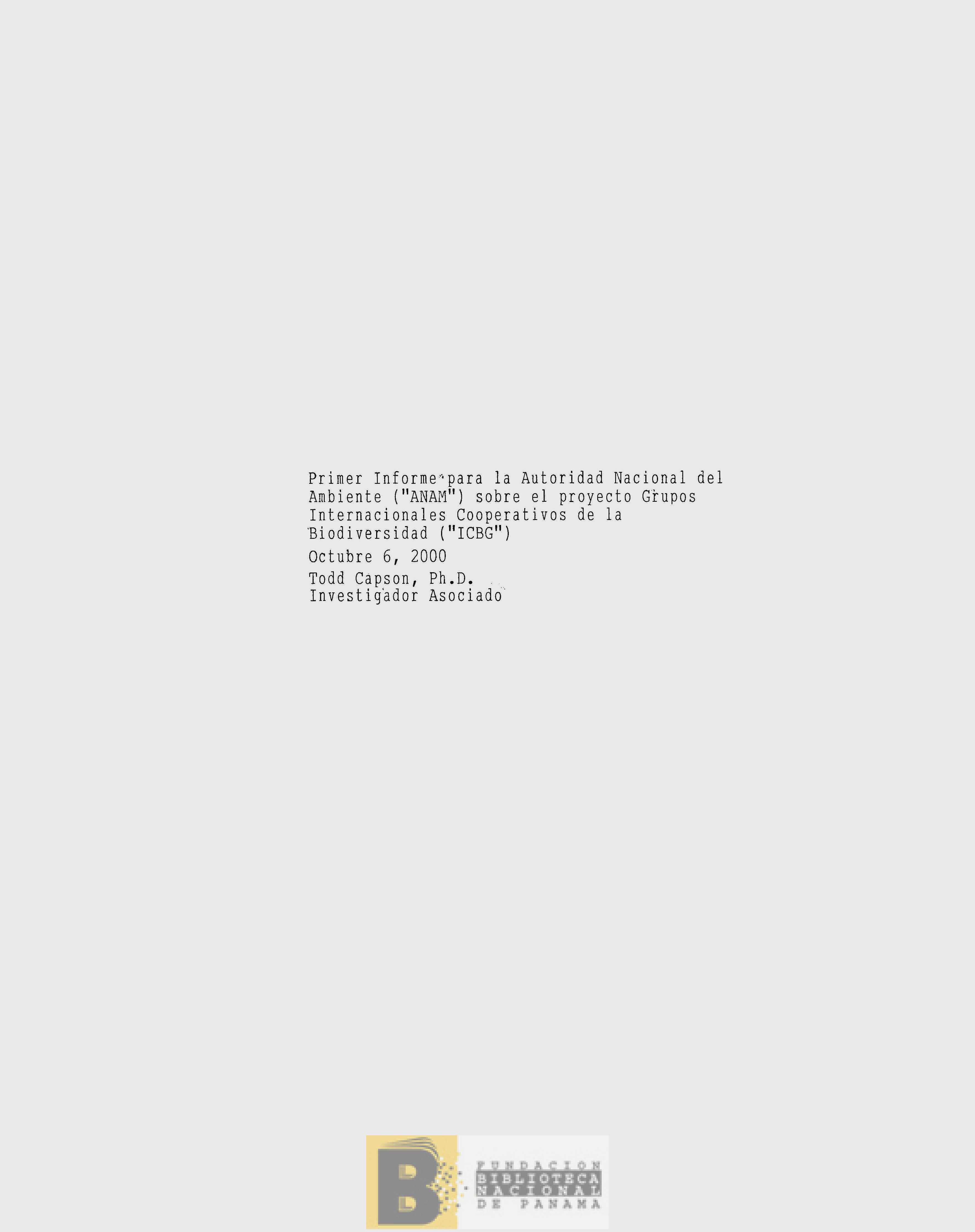 2362. Primer informe para la Autoridad Nacional del Ambiente ("ANAM") sobre el proyecto Grupos Internacionales Cooperativos de la Biodiversidad ("ICBG")