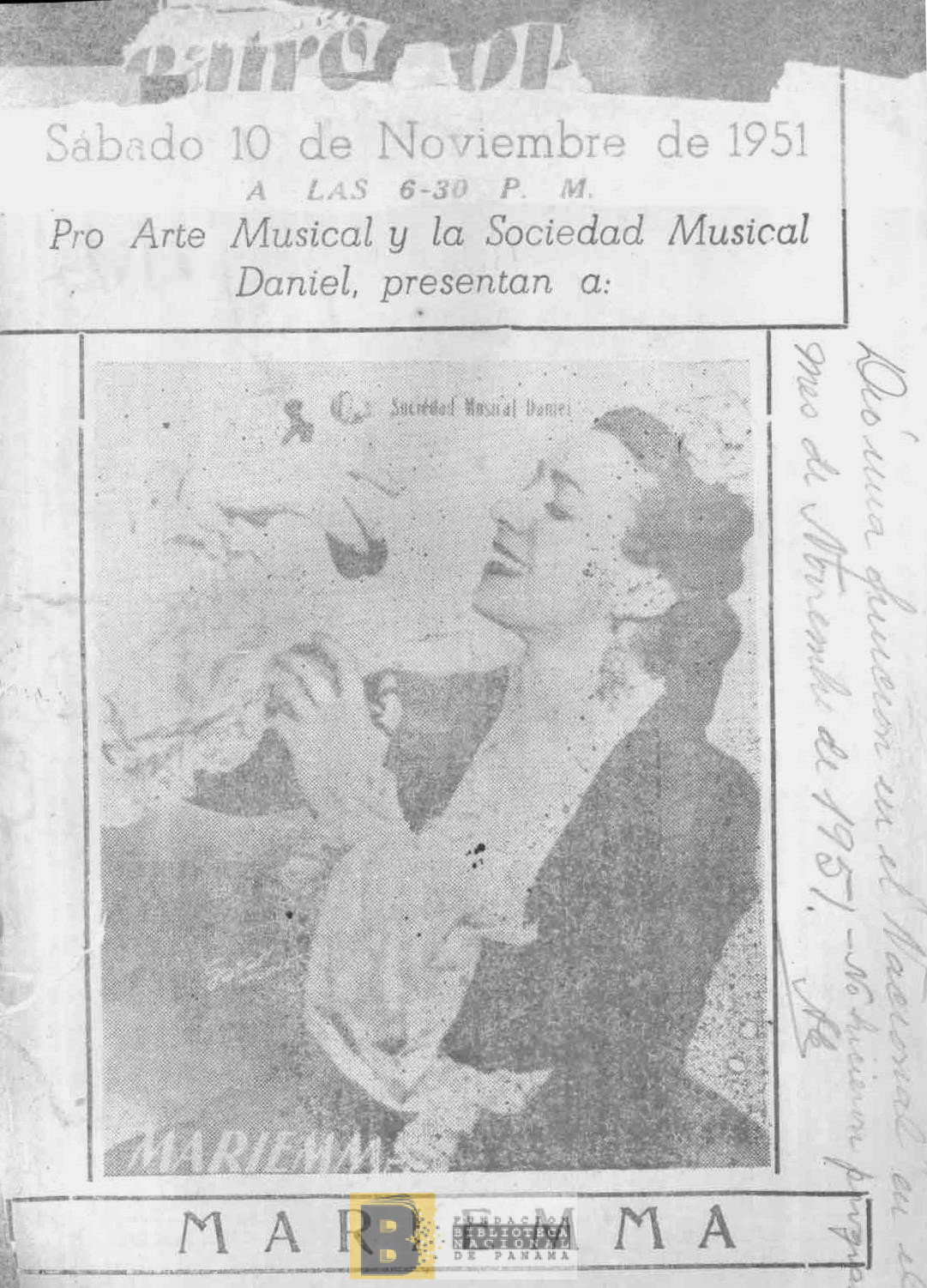 2373. Pro Arte Musical y la Sociedad Musical Daniel, presentan a Mariemma, Enrique Luzuriaga (pianista), Paco de la Isla (guitarrista)