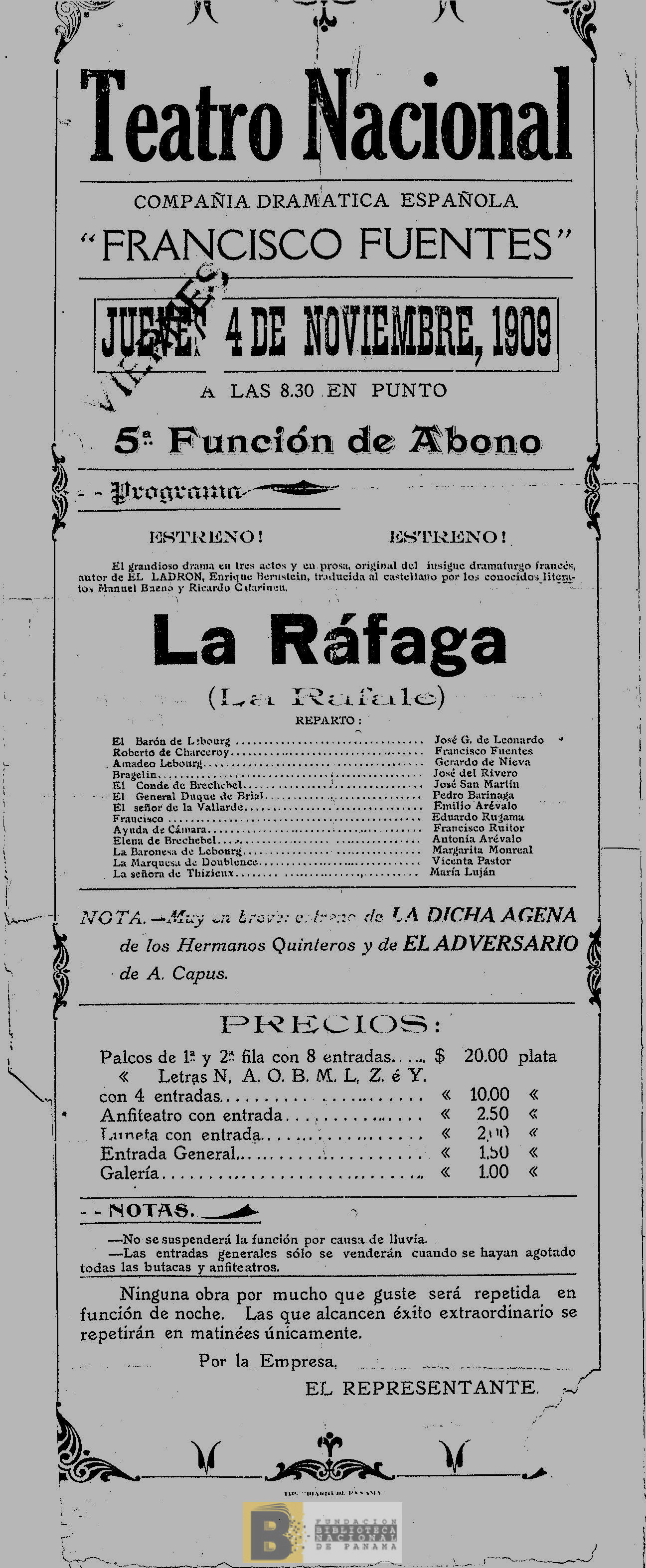 2473. La ráfaga (La rafale): drama en tres actos y en prosa, original del insigne dramaturgo francés, Enrique Bernstein, traducida al castellano por los conocidos literatos Manuel Bueno y Ricardo Catarineu