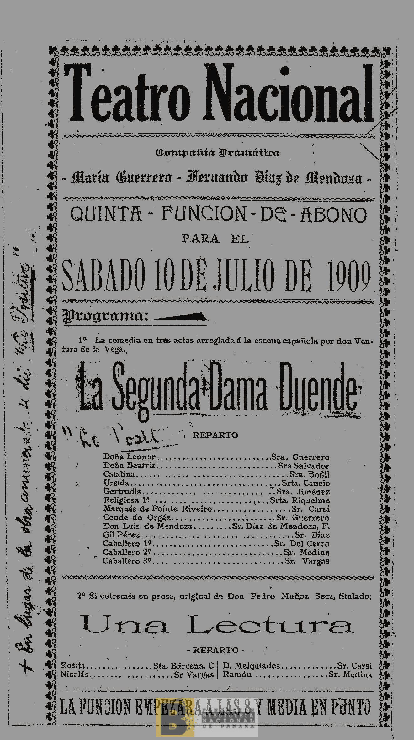 2617. La segunda dama duende: comedia en tres actos arreglada a la escena española por don Ventura de la Vega ; Una lectura : entremés en prosa, original de don Pedro Muñoz Seca