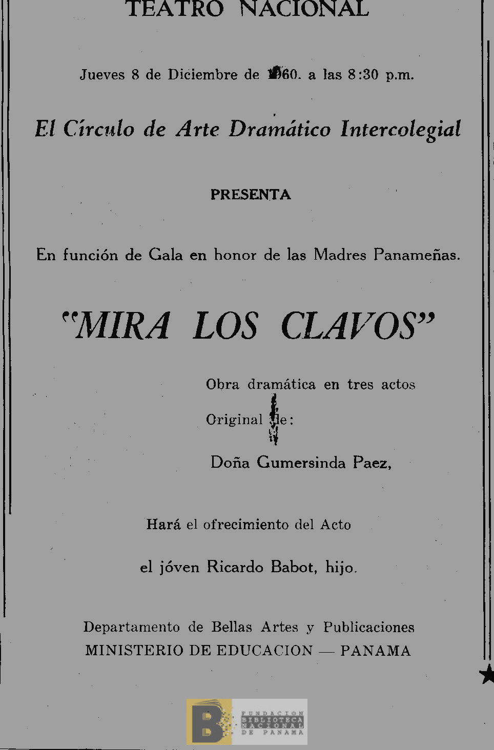 396. El Círculo de Arte Dramático Intercolegial presenta en función de gala en honor de las madres "Mira los clavos": obra dramática en tres actos, original de Gumercinda Páez