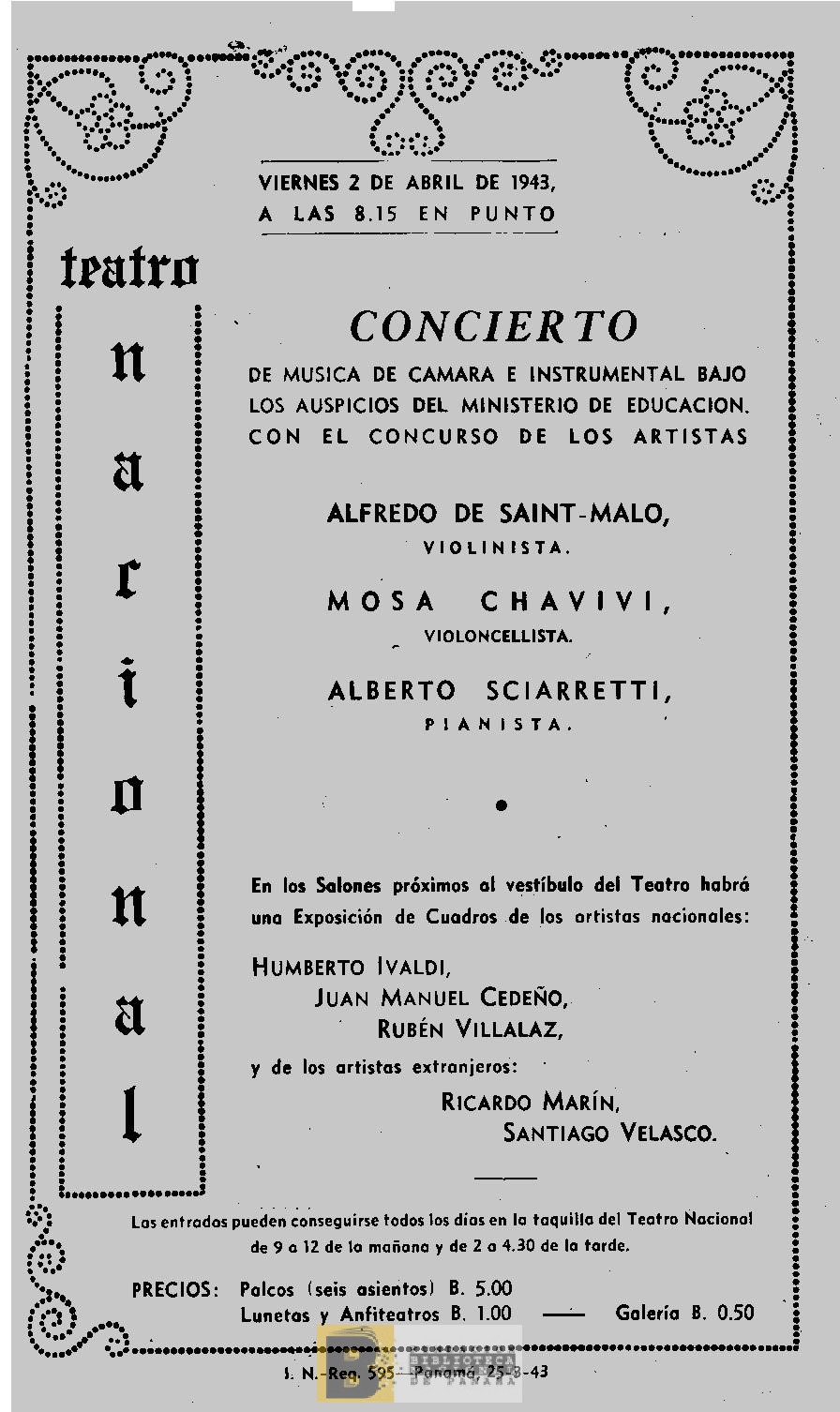 473. Concierto de música de cámara e instrumental bajo los auspicios del Ministerio de Educación con el concurso de los artistas Alfredo de Saint Malo, Mosa Chavivi, Alberto Sciarretti
