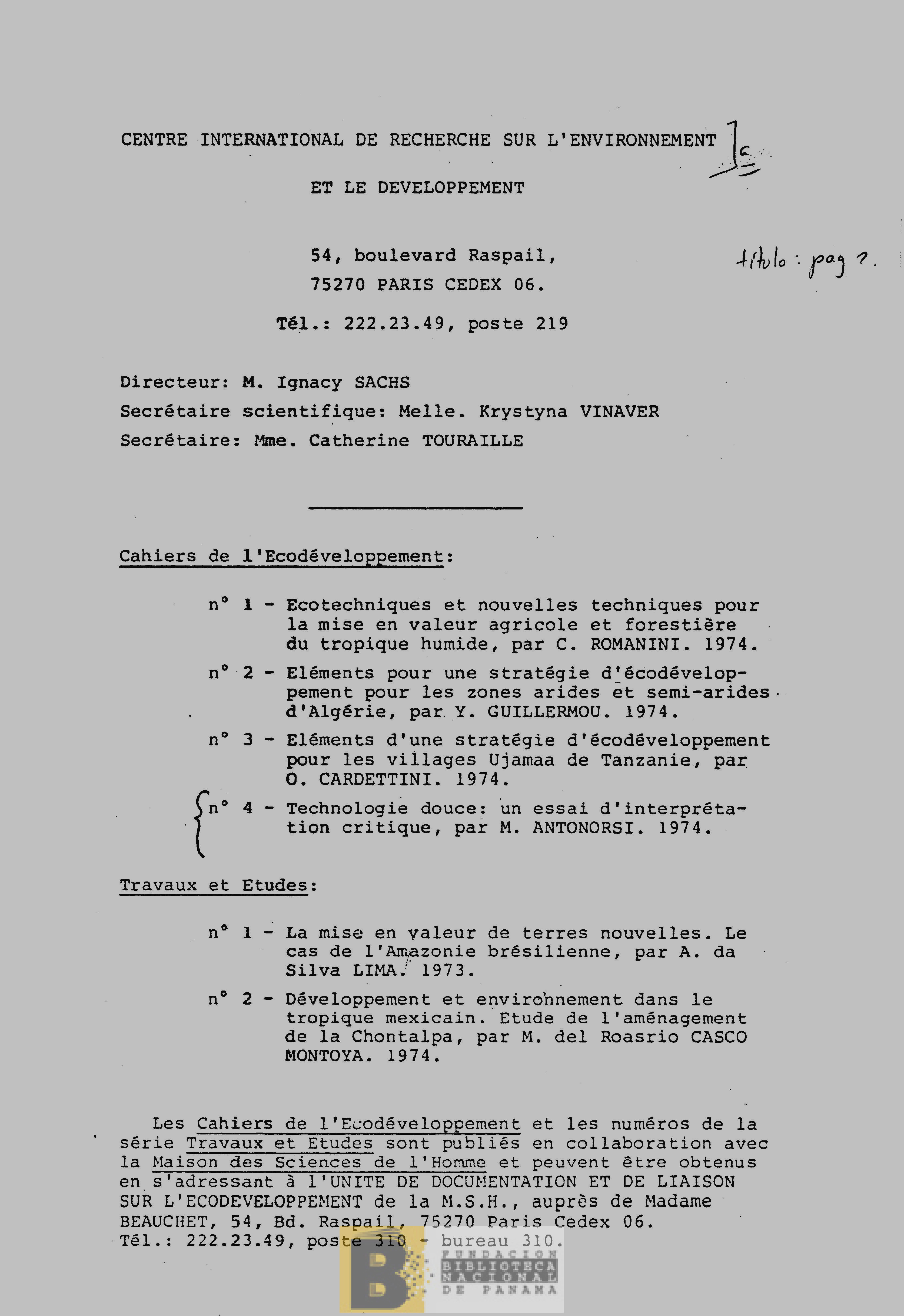 802. Ecodéveloppement: présentation générale du projet d'écodéveloppement