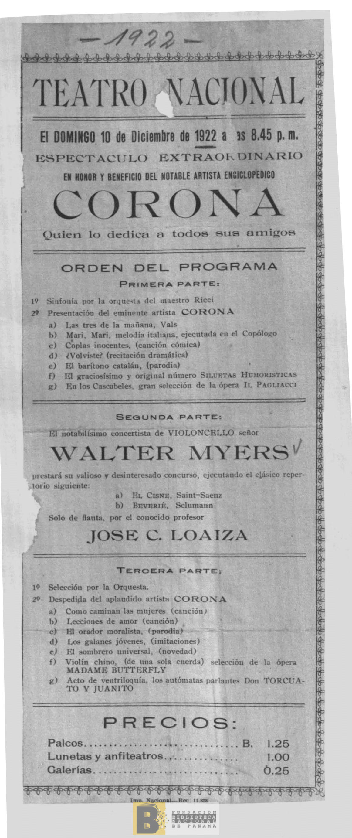 922. Espectáculo extraordinario en honor y beneficio del notable artista enciclopédico Corona, quien lo dedica a todos sus amigos