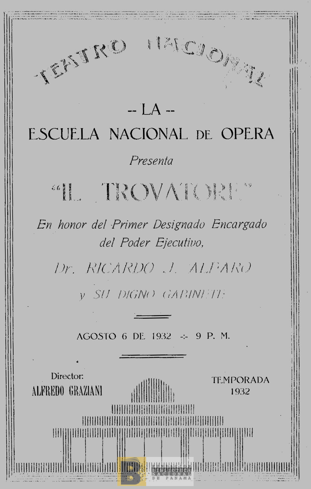 921. La Escuela Nacional de Ópera presenta "Il Trovatore" en honor del primer Designado encargado del Poder Ejecutivo Dr. Ricardo J. Alfaro y su digno Gabinete