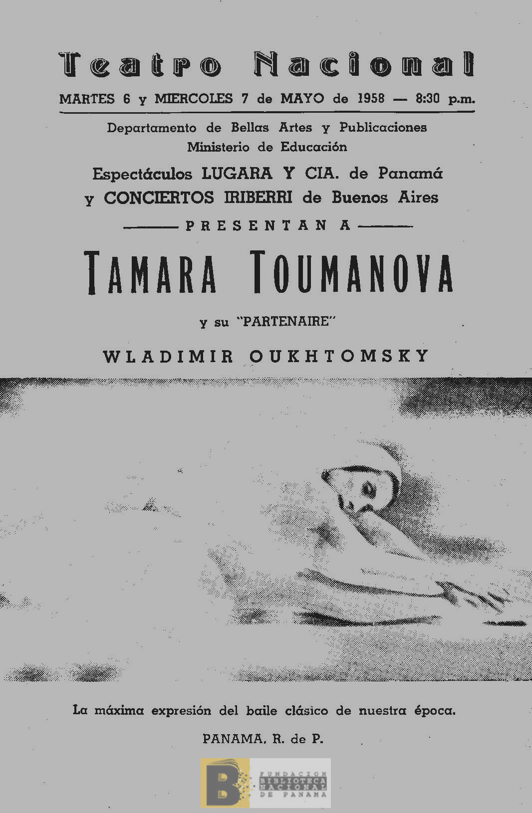 924. Espectáculos Lugara y Cía. de Panamá y Conciertos Iriberri de Buenos Aires presentan a Tamara Toumanova y su partenaire Wladimir Oukhtomsky, la máxima expresión del baile clásico de nuestra época