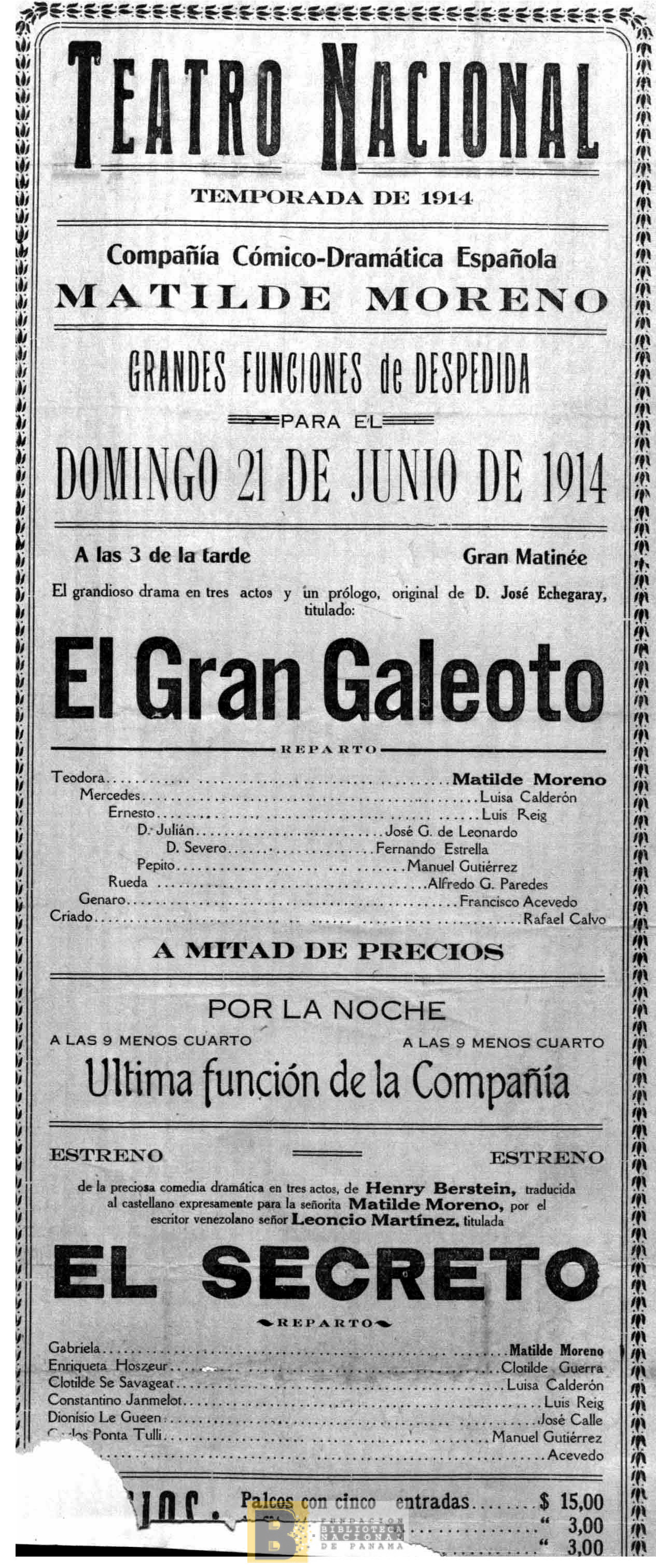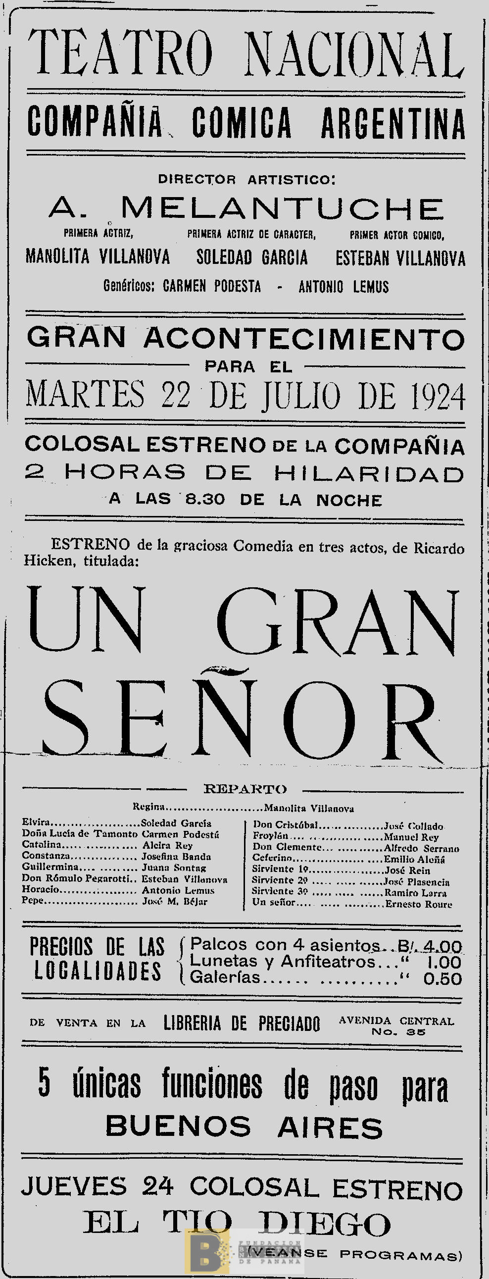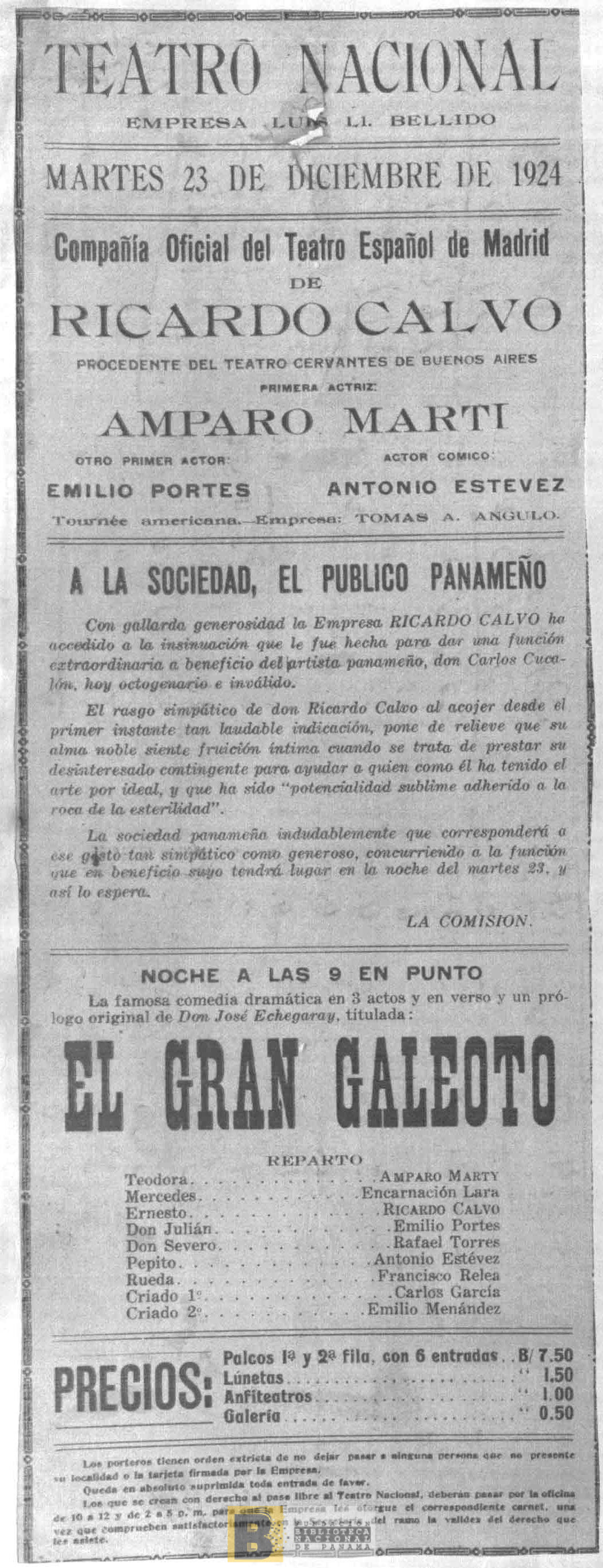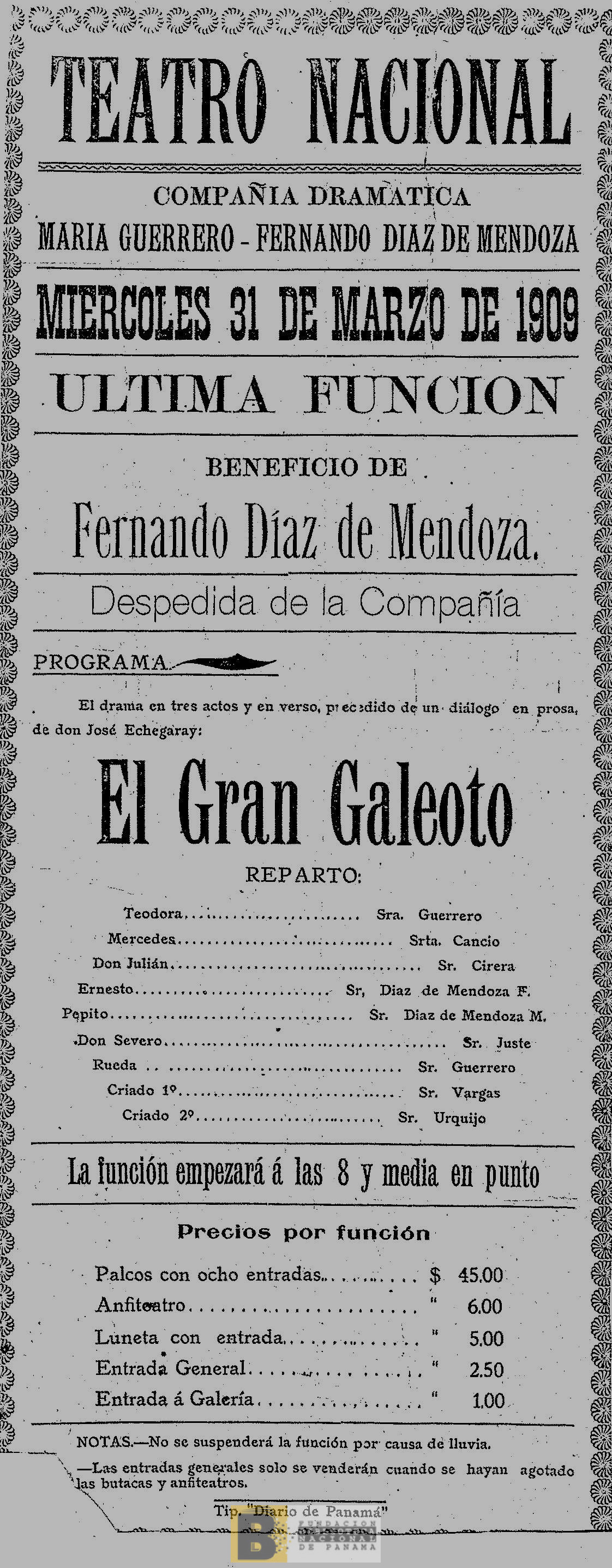 1327. Gran función de gala a beneficio del afanado artista nacional Tomás Badiola, con asistencia del exmo. Dr. Belisario Porras y Señora