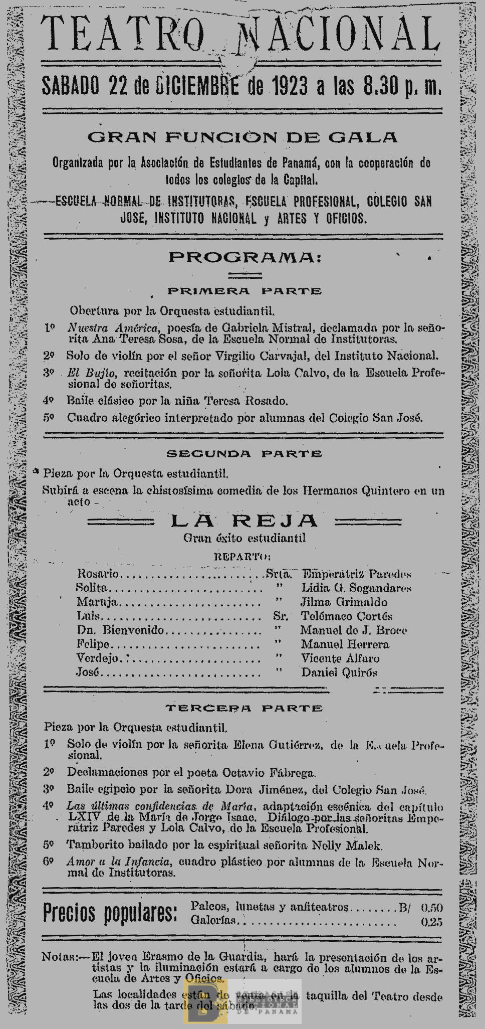 1329. Gran función de gala organizada por la Asociación de Estudiantes de Panamá, con la cooperación de todos los colegios de la capital: Escuela Normal de Institutoras, Escuela Profesional, Colegio San José, Instituto Nacional y Artes y Oficios