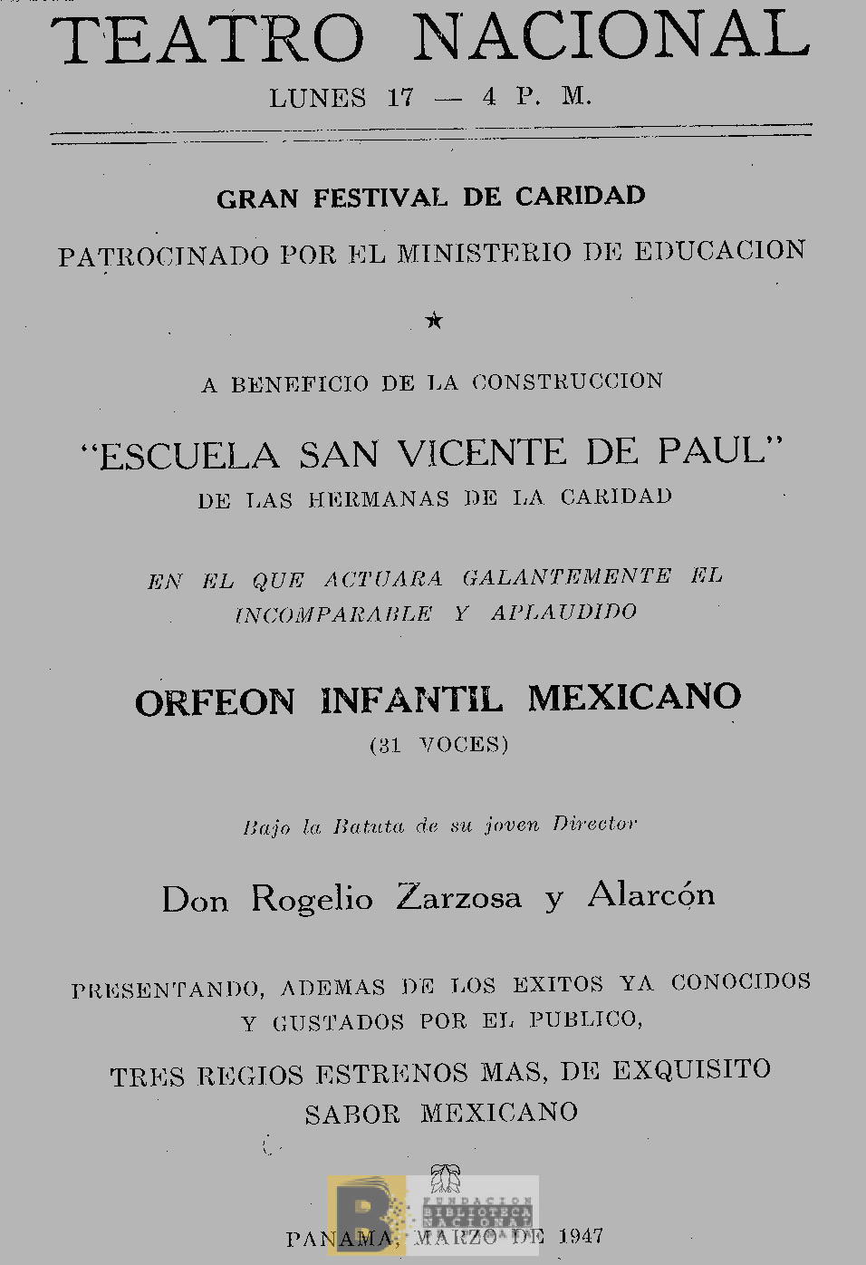 1325. Gran festival de caridad patrocinado por el Ministerio de Educación, a beneficio de la construcción de la Escuela San Vicente de Paul de las Hermanas de la Caridad, en el que actuará galantemente el incomparable y aplaudido Orfeón Infantil Mexicano