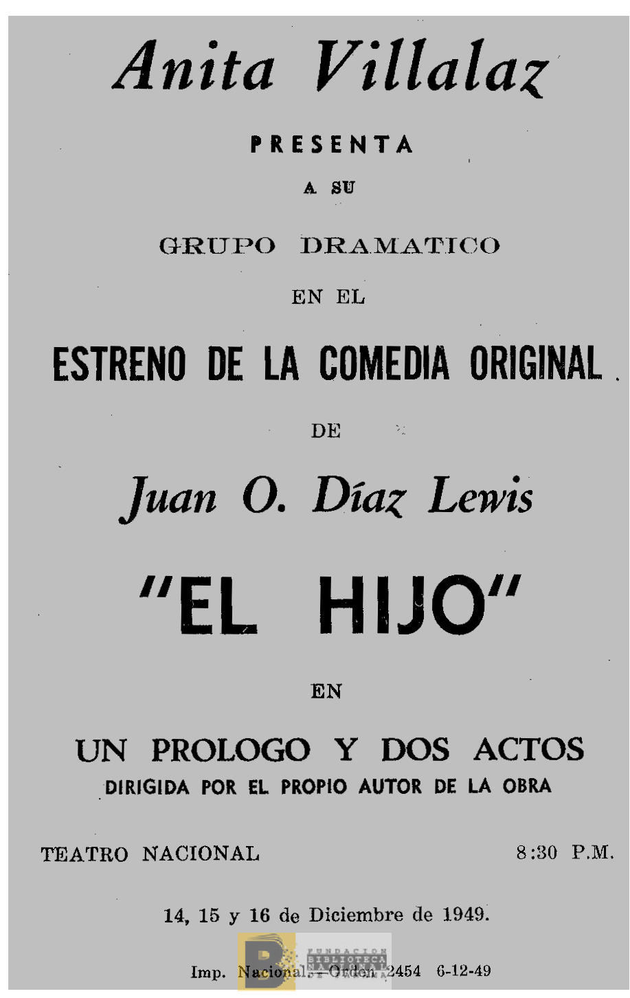 138. Anita Villalaz presenta a su Grupo Dramático en el estreno de la comedia original de Juan O. Díaz Lewis "El hijo" en un prólogo y dos actos, dirigida por el propio autor de la obra