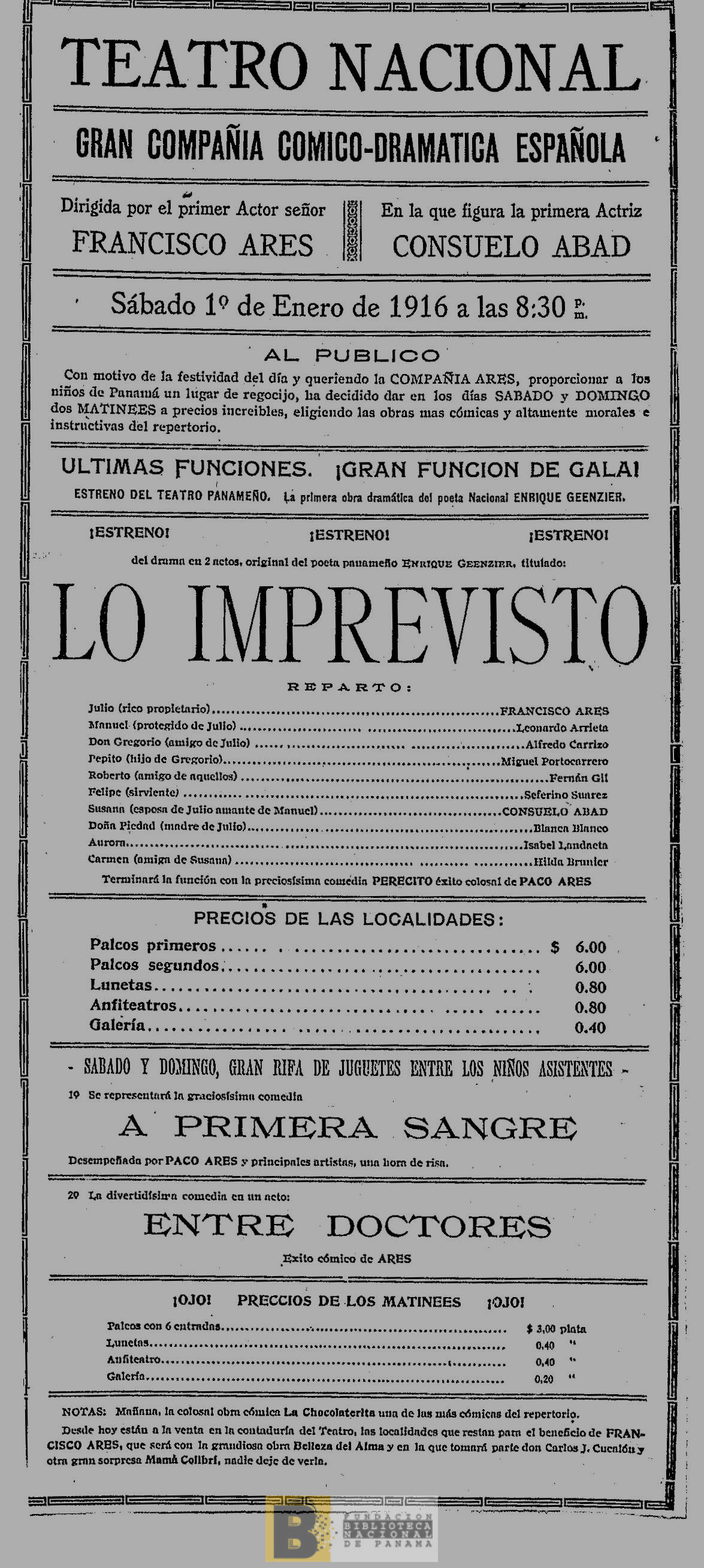 1430. Lo imprevisto: drama en 2 actos, original del poeta panameño Enrique Geenzier