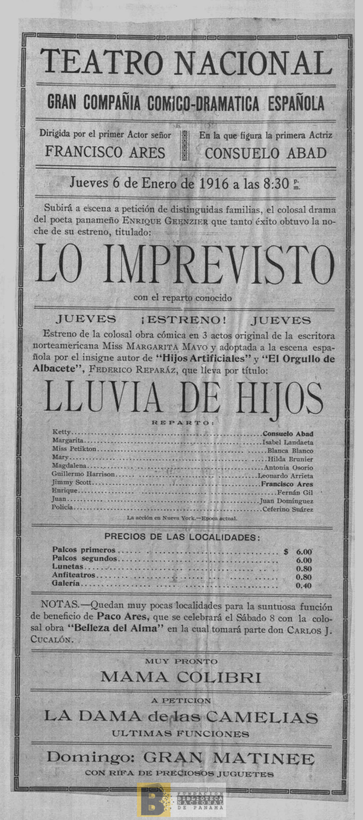 1429. Lo imprevisto: drama del poeta panameño Enrique Geenzier ; Lluvia de hijos: Obra cómica en 3 actos original de la escritora norteamericana Miss Margarita Mayo y adaptada a la escena española por el insigne autor Federico Reparaz