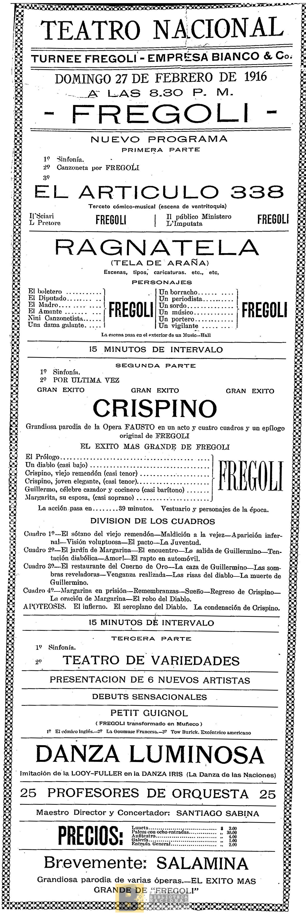 175. El artículo 338: terceto cómico musical ; Ragnatela ; Crispino: parodia de la Ópera Fausto en un acto y cuatro cuadros y un epílogo, original de Frégoli ; Danza luminosa