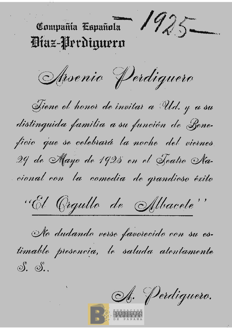 173. [Arsenio Perdiguero invita a su función del viernes 29 de mayo de 1925 en el Teatro Nacional con la comedia "El orgullo de Albacete"